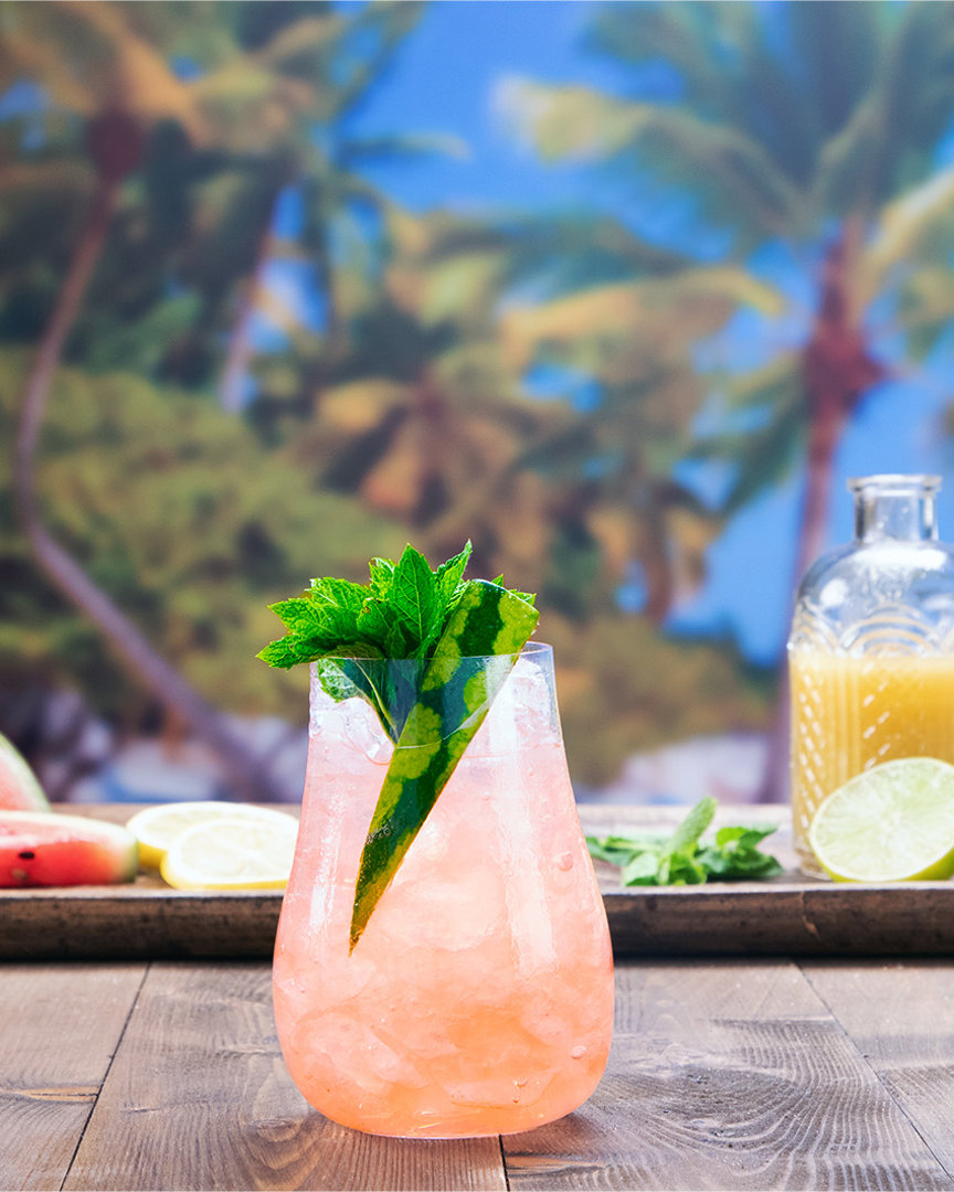 Muddle mint and watermelon juice with simple syrup in a shaker,